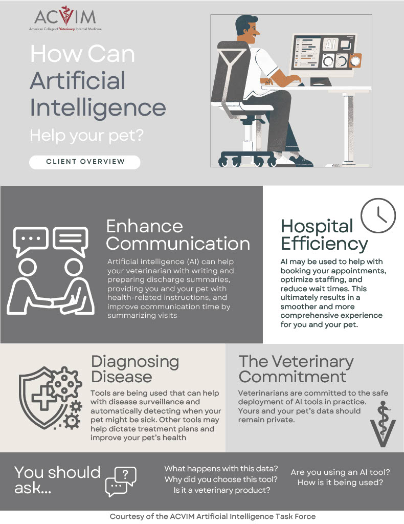 As highlighted by the ACVIM Artificial Intelligence Task Force, AI tools can help veterinarians enhance communication, streamline appointments, and even support early disease detection. From clearer discharge instructions to improved hospital efficiency and smarter diagnostic support, AI allows your veterinary team to spend more quality time focused on what matters most, your pet’s health.